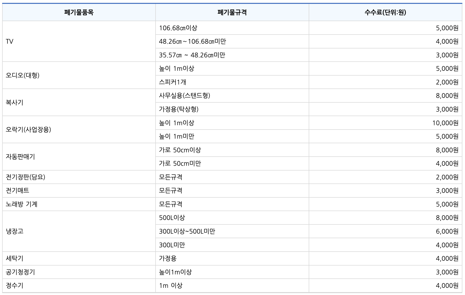 고양시 가전제품 품목별 수수료