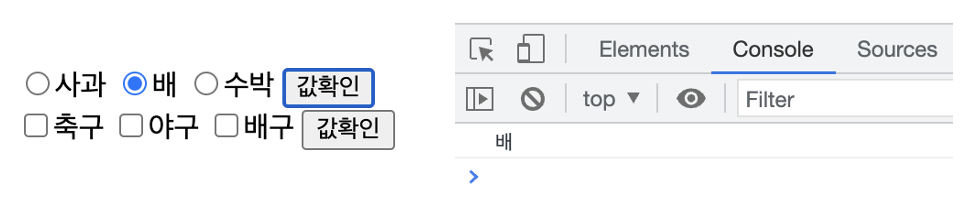 라디오 버튼 "배"를 선택 후, "값확인"을 누른 결과를