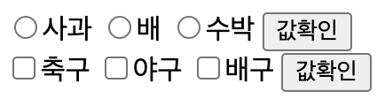 체크박스 "축구","야구" 선택 후, "값확인"을 누른 결과를