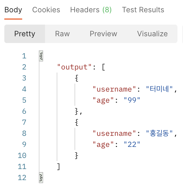 Send 버튼을 누르면 response로 아래와 같이 나옵니다.