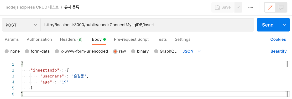 그리고 request 데이터는 body에 json타입으로 nodejs 서버에 보냅니다.